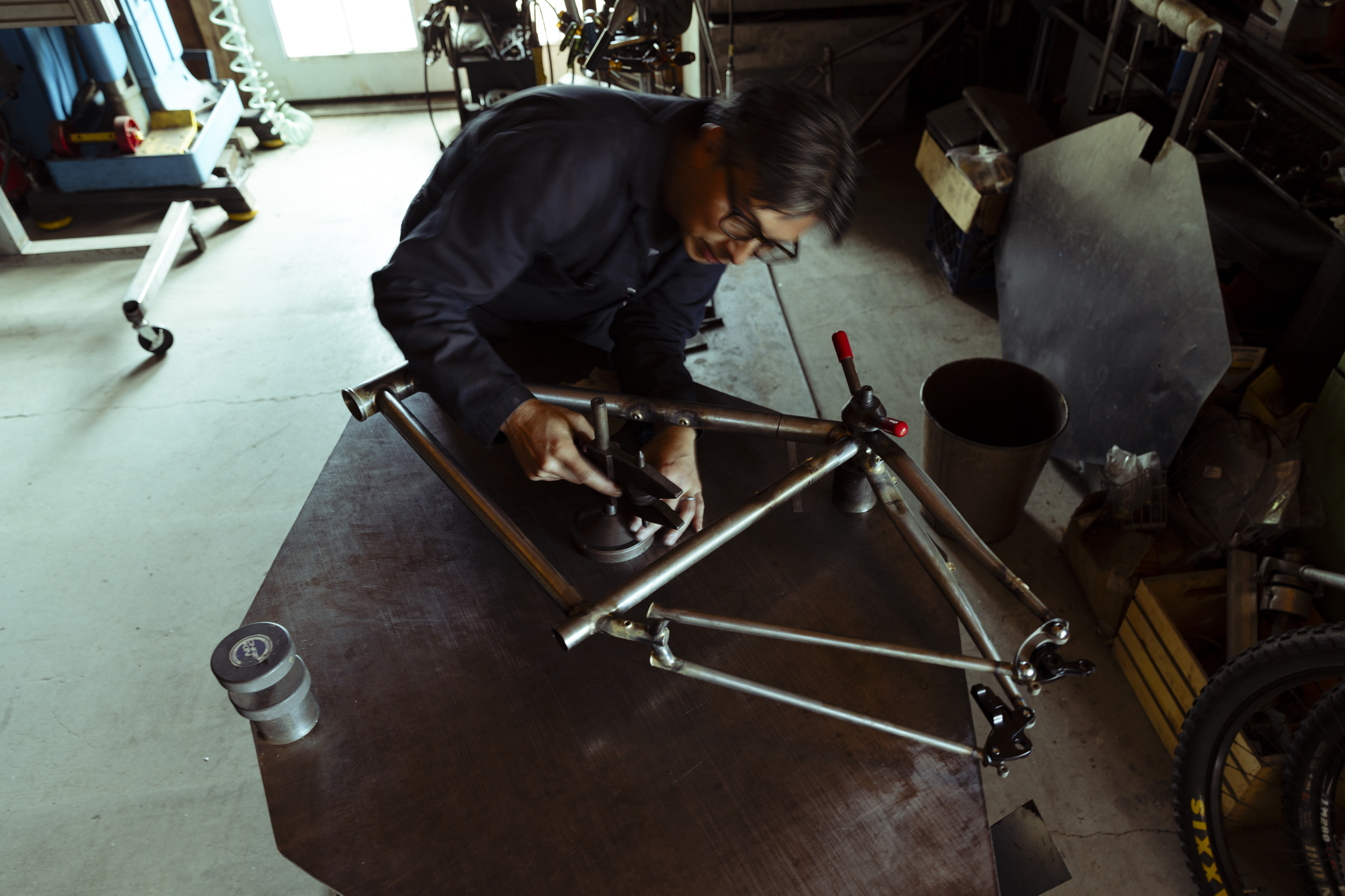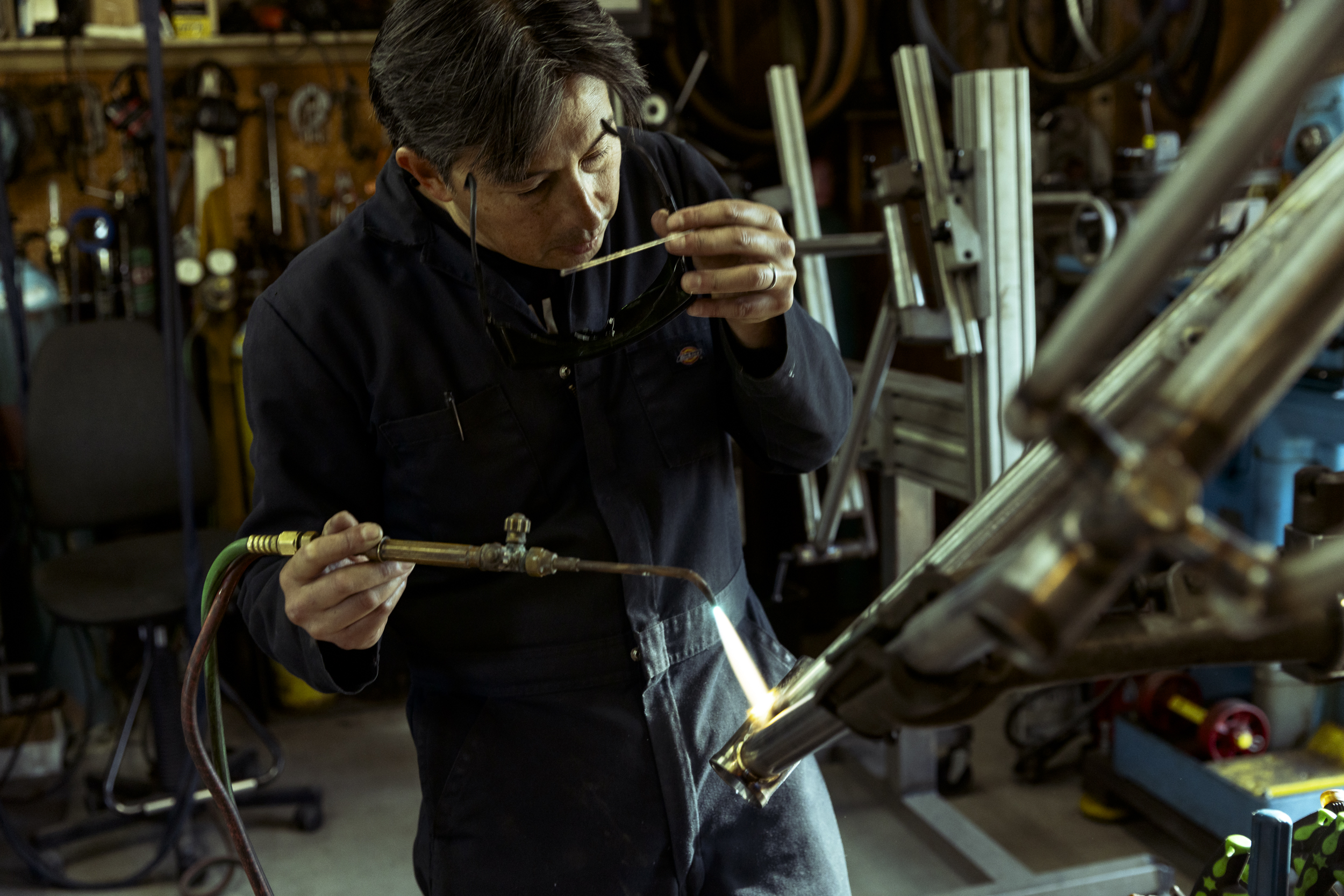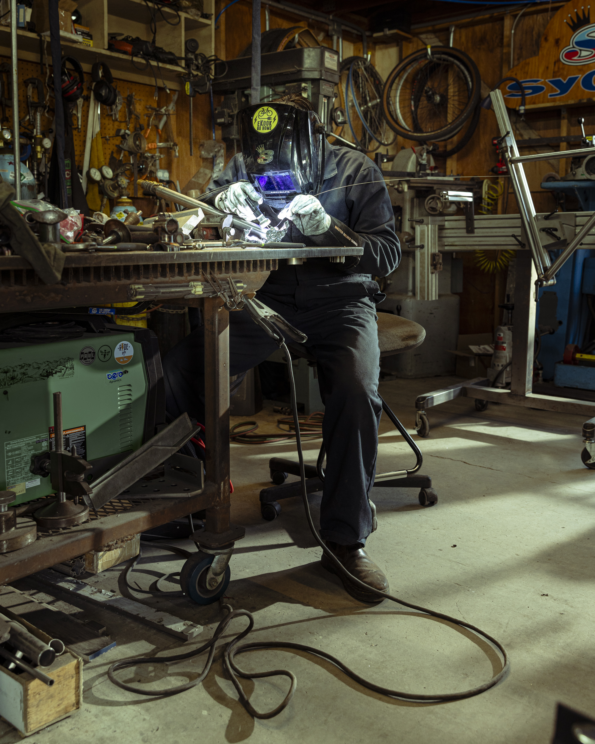 My grandfather was a shipwright, and when I first entered the Sycip shop, I was instantly transported to a memory of the old boatyard. My nose rang with the familiar smell of cutting fluid, and my eyes settled easily into the patterns of ordered chaos created by a lifetime of manipulating raw materials into meaningful machines. My grandfather’s shop was a place that was full or purpose, it was a sort of comfortably dim, utilitarian space lit almost entirely by natural light from the open half of the building that faced out to the Pacific ocean. A perpetual tangle of machines, lumber and salvaged parts seemed to organically grow out of every corner, reaching towards the vessel suspended in the middle. I quickly understood that I wanted Jeremy’s shop to be lit and photographed in a stylistic echo of my childhood memories - Jeremy and his machines at the center of the mayhem looking moody and mysterious in the dim, natural glow with just a sprinkle of danger-light from his welding torch.